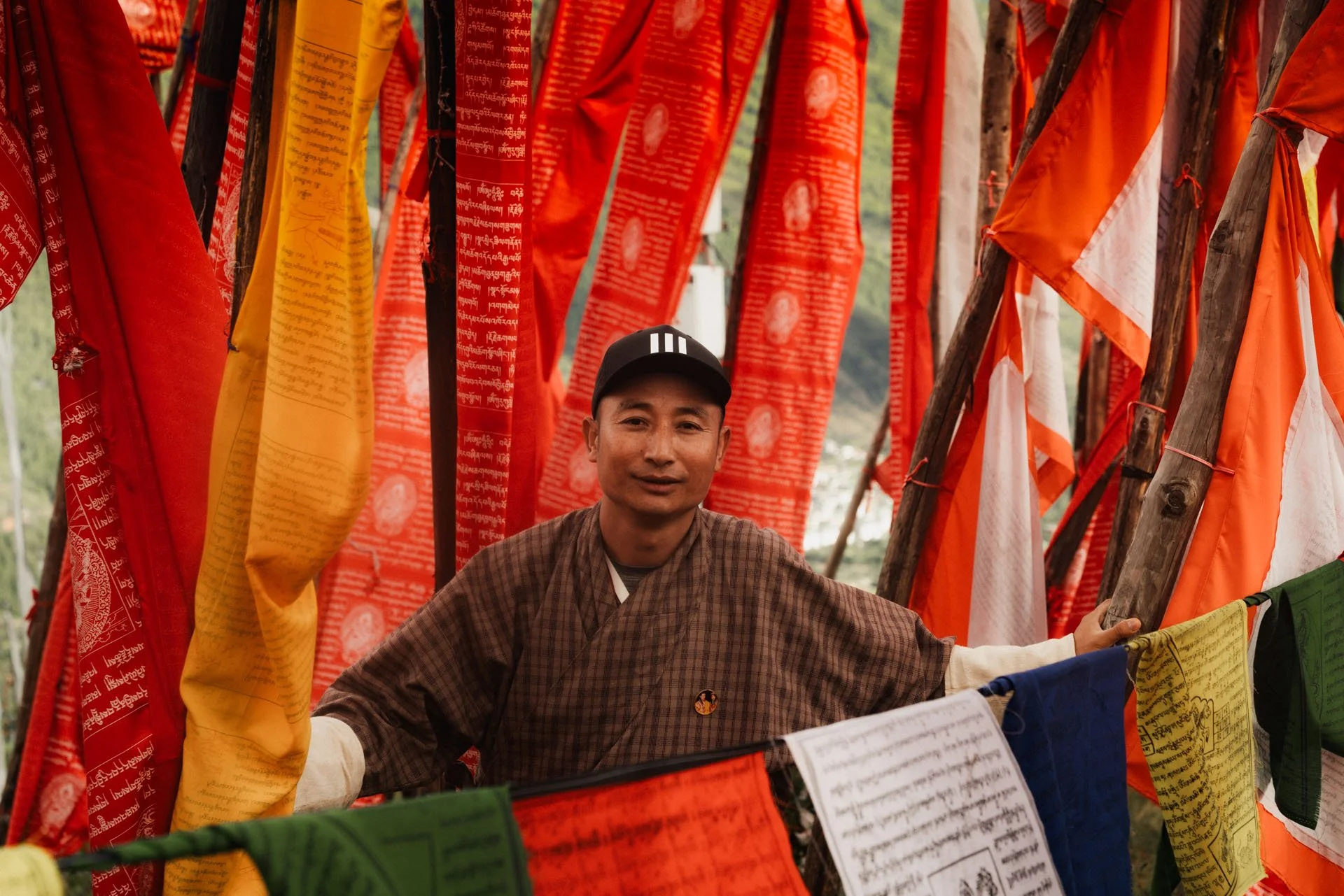 Woven into the wind: Our guide, Kinley, stands among the fluttering prayers of Bhutan. Photo: Alex Pflaum