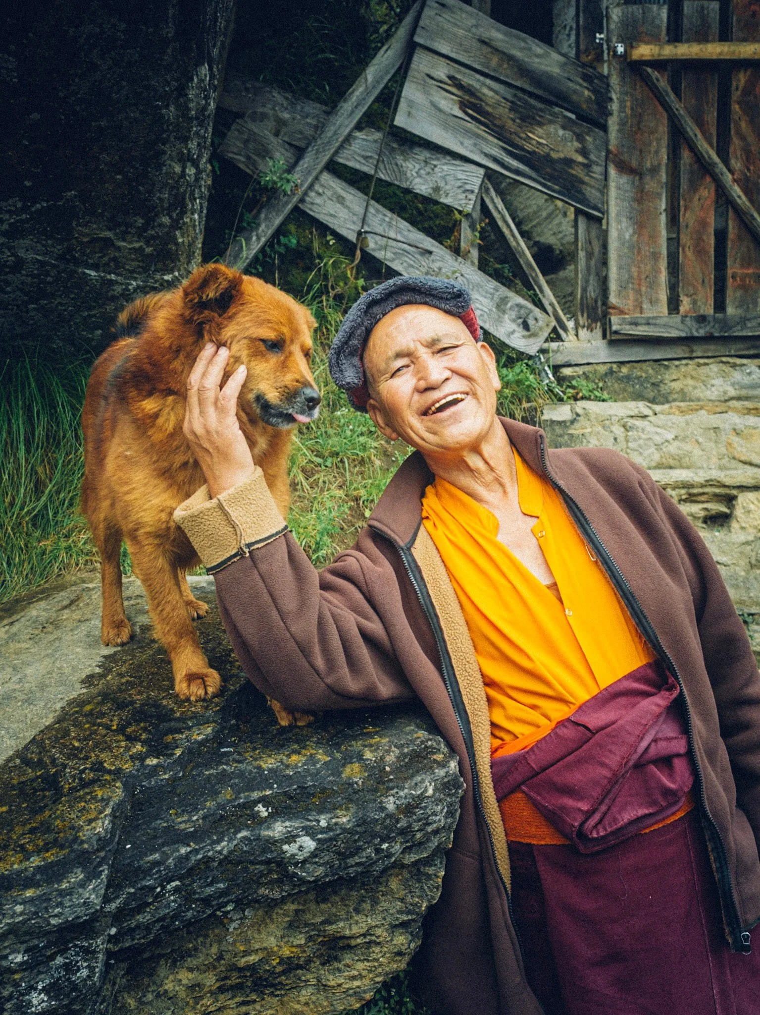 Trailside smiles and a furry friend on the path to Paro Taktsang Monastery. Photo: Ian Haigh